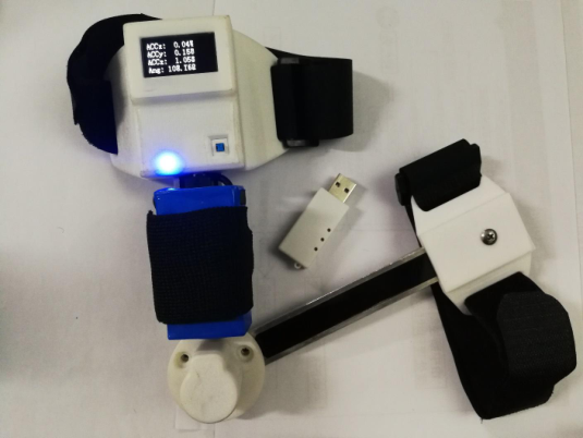 本裝置是基于加速度傳感器和角度傳感器的痙攣狀態(tài)評估,可實(shí)時顯示小臂(小腿)的X/Y/Z三軸加速度信號和肘關(guān)節(jié)(膝關(guān)節(jié))的角度信號,并通過藍(lán)牙無線傳輸數(shù)據(jù)。基于人體痙攣時的加速度信號和角度信號的特征,求出痙攣時的牽張反射閾值,實(shí)現(xiàn)痙攣狀態(tài)等級的定量評定。本裝置外形美觀,簡潔實(shí)用,便攜,易于臨床推廣